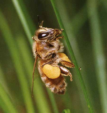 Click to enlarge! Honey bees carry pollen back to the hive in a small "basket" of fine hairs on the outside of their hind legs. As the bee scrapes pollen off its body, hairs on the leg collect the pollen. It is then transferred to the basket opening with a minute comb at the mid-joint of the leg. There is even a "pollen press" as part of the joint that will pack the pollen into these baskets. When the basket is full the bee will return to the hive and unload the pollen "pellets" out of the baskets into a cell. The house bees then take care of packing the pollen down in the cell until it's needed for food for the brood.